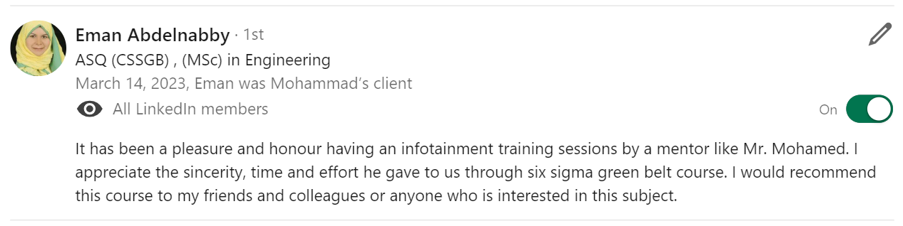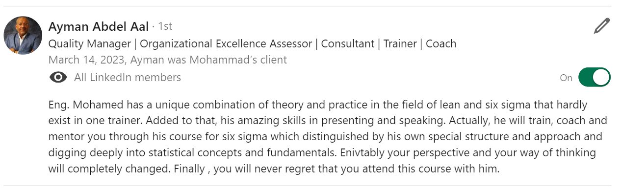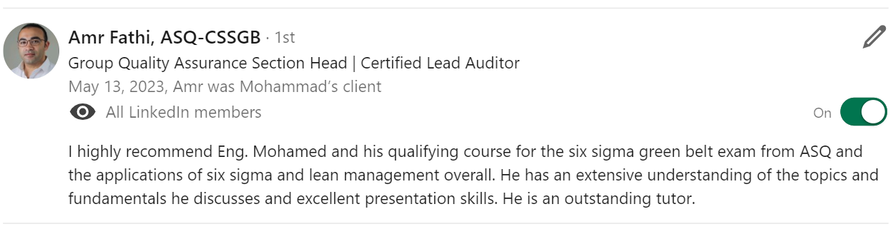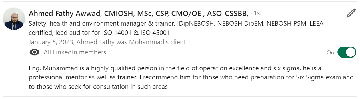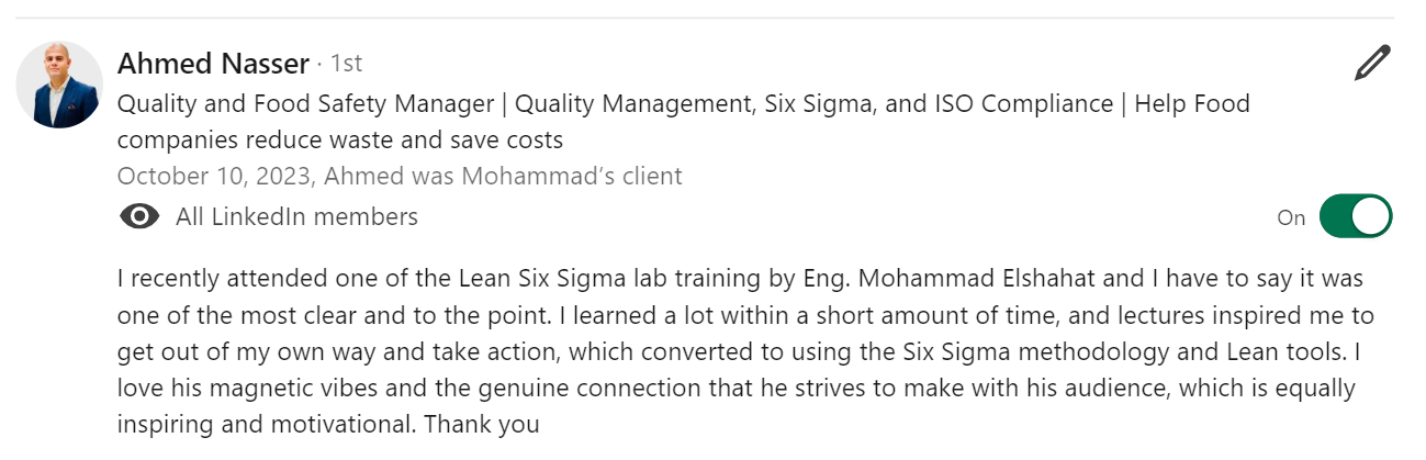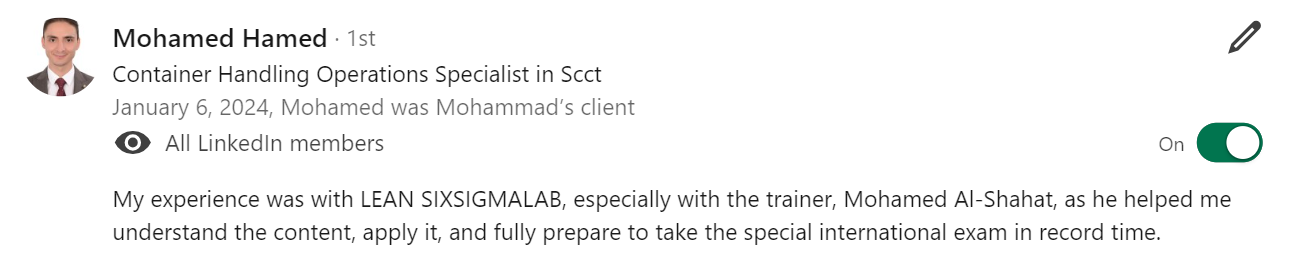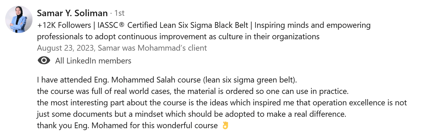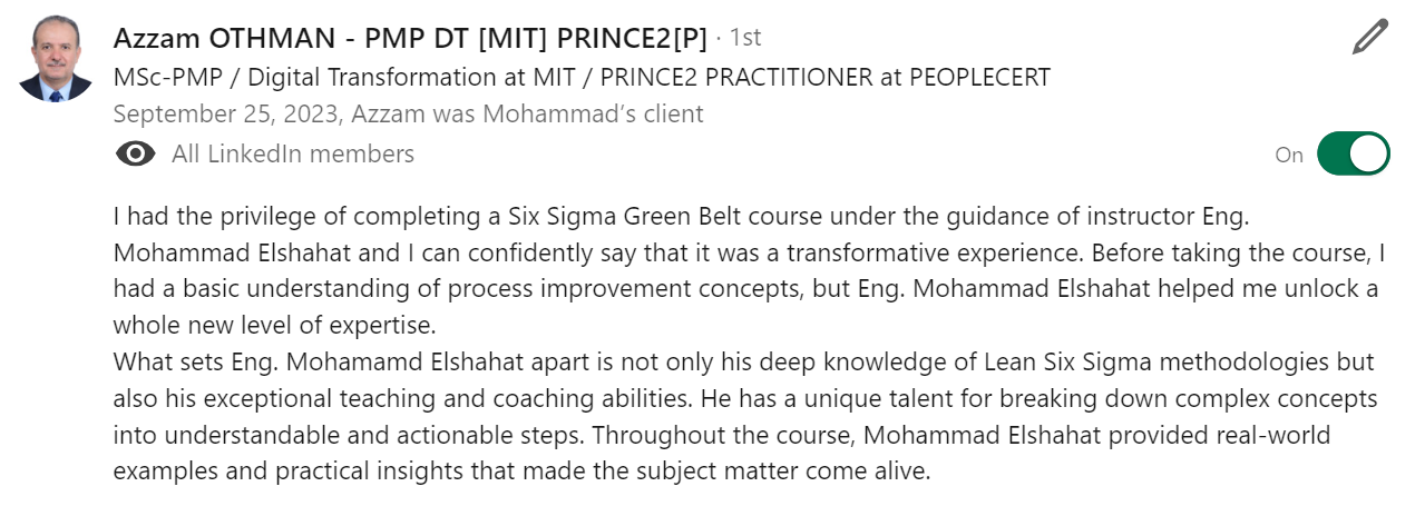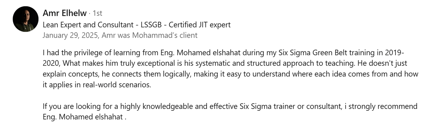 Work privately with M. Elshahat for 90 days to earn your certification and kickstart your first Lean Six Sigma project — with expert support, project clarity, and full accountability.