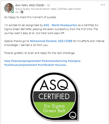 A Practical Training Program to equip you with the strategies, techniques, and tools to become True Lean Six Sigma practitioner, and to be internationally recognized from The American Society for Quality (ASQ)