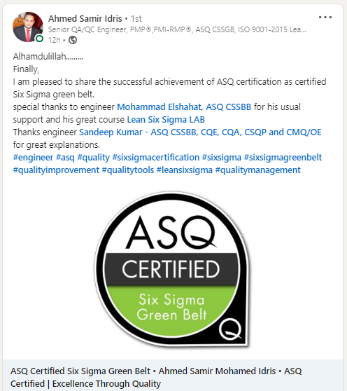 Not Only ASQ Certified Green Belt, But Also Lean Six Sigma Practitioner