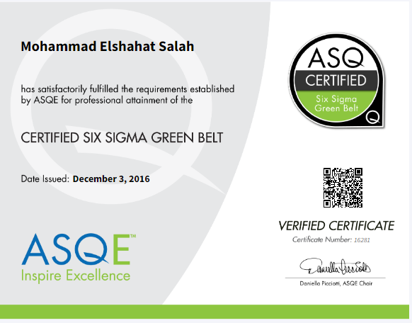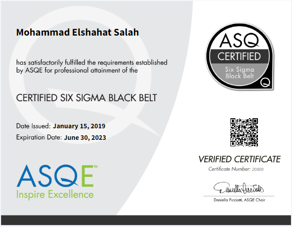 I'm Certified Six Sigma Black Belt from The American Society for Quality (ASQ), as well as Certified in Lean Manufacturing from Society for Manufacturing Engineers (SME)